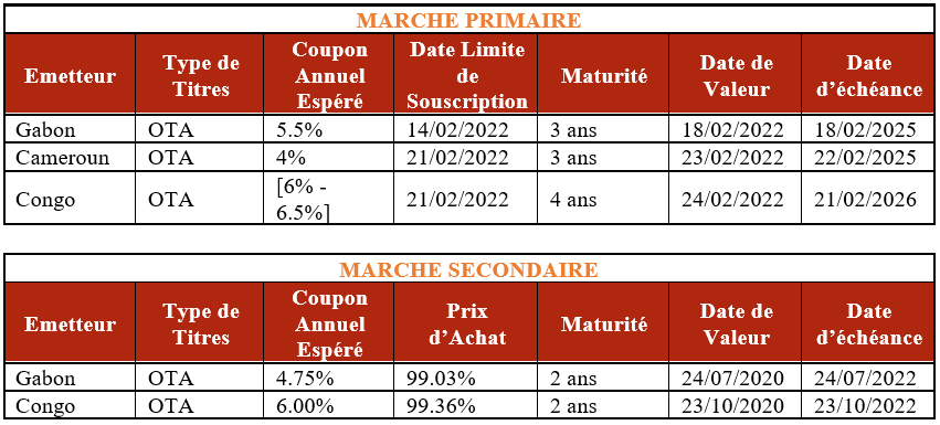 Nous sommes ravis de vous présenter les opportunités d’investissement sur les marchés de la CEMAC en date du 18 Janvier 2022 :